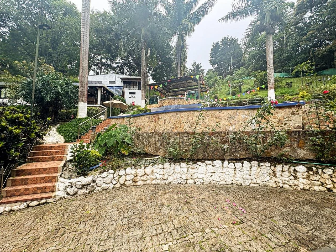 El camino empedrado y las escaleras de ladrillo conducen hacia la zona superior, donde se encuentra la piscina y las áreas sociales, creando una sensación de amplitud y conexión con el entorno natural. La combinación de materiales como piedra, ladrillo y vegetación refuerza la esencia campestre del lugar, ofreciendo un ambiente cálido, fresco y relajante